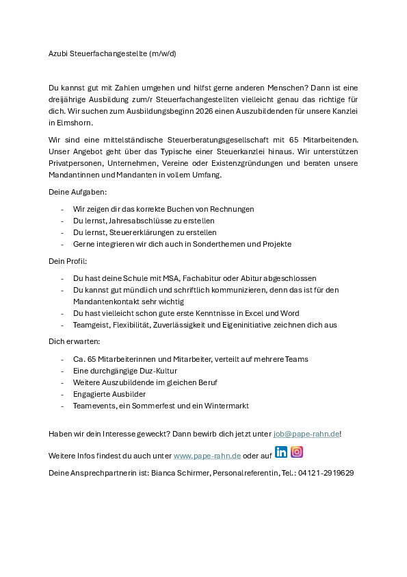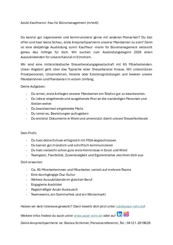 Personalreferentin @ PAPE+RAHN PartG mbB Steuerberatungsgesellschaft