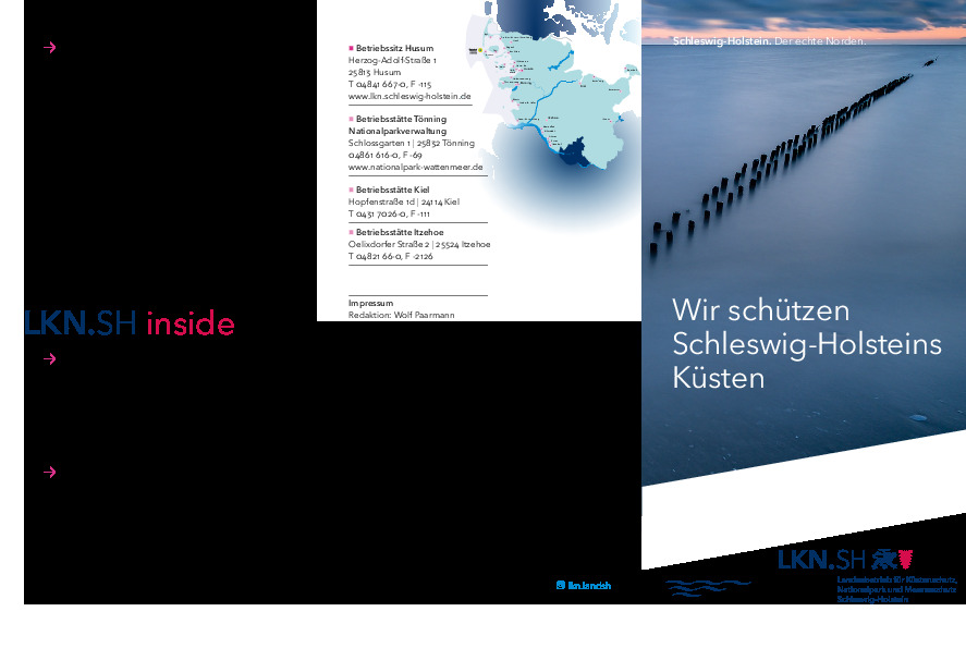 Die mehr als 1.100 km lange Küste prägt unser Land ebenso wie mehr als 300 Seen sowie 30.000 km Bäche und Flüsse. Ein hochattraktiver Lebens- und Erholungsraum, der uns aber auch verpflichtet, Vorsorge zu treffen, besteht ein Viertel unseres Landes doch aus Küstenniederungen. Auch mit der einzigartigen Natur müssen wir verantwortungsvoll umgehen. Der als Weltnaturerbe ausgezeichnete Nationalpark Wattenmeer ragt dabei heraus. Der LKN.SH schützt unser Land erfolgreich - für Mensch und Natur.