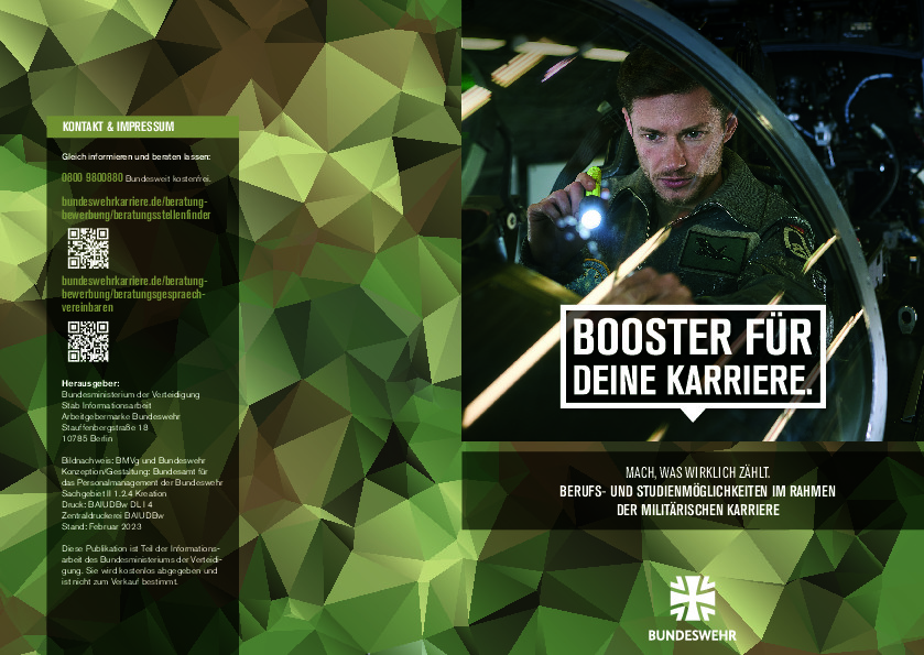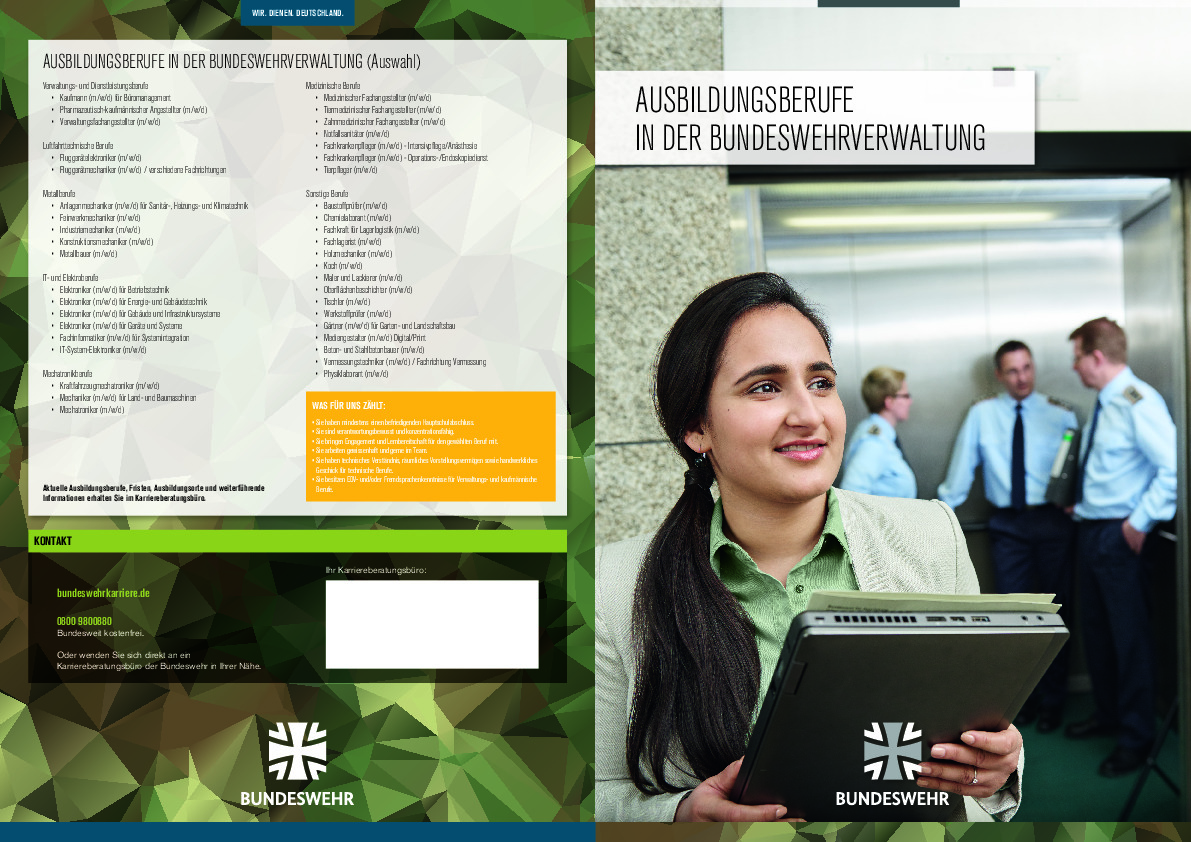 Die Bundeswehr ist ein bundesweiter Arbeitgeber mit über 40 verschiedenen Berufsausbildungen, über 25 verschiedenen Studiengängen und vieler weiterer Karrieremöglichkeiten.