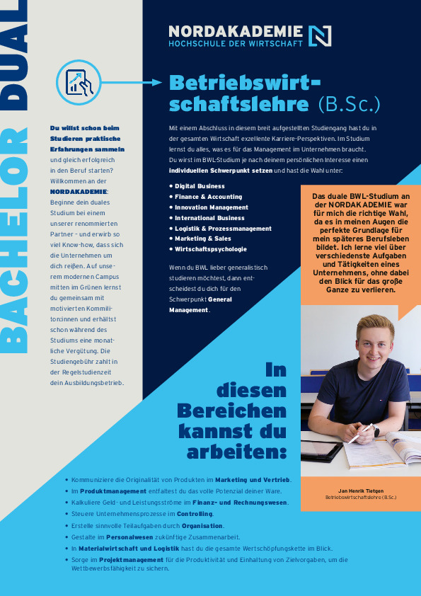 Der duale Studiengang „Betriebswirtschaftslehre“ an der NORDAKADEMIE bietet dir eine umfassende, praxisnahe und ganzheitliche Qualifizierung. Für Unternehmen bist du damit eine gesuchte Nachwuchskraft für die vielfältigsten Aufgaben in allen kaufmännischen Funktionen.